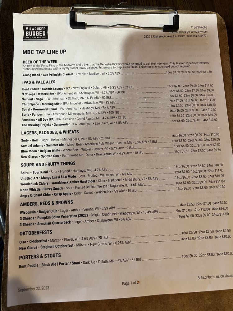 Milwaukee Burger Company is a sports bar located in Eau Claire, WI, offering a variety of delicious options such as chicken wings and burgers. They cater to various dietary preferences with vegan and vegetarian options available. The casual atmosphere with moderate noise levels makes it a great spot for groups, kids, and even late-night dining. The restaurant provides amenities like wheelchair accessibility, outdoor seating, and free Wi-Fi. Customers rave about the tasty food, friendly staff, and clean environment. The menu features items like cheese curds, the defibrillator burger, and unique cocktails like the orange old fashioned. Overall, Milwaukee Burger Company is a must-visit for those looking for a fun dining experience with great food and excellent service.